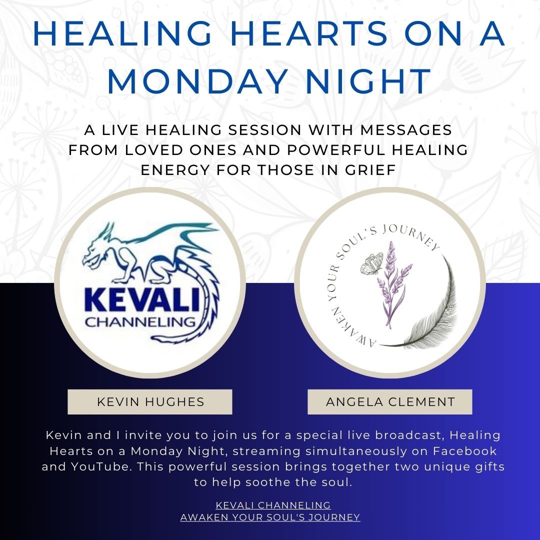 You are invited to join Kevin "the Medium" of Kevali Channeling and me, Angela of Awaken Your Soul's Journey as we go live every Monday evening on Facebook and YouTube for what we call Healing Hearts on a Monday Night.